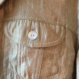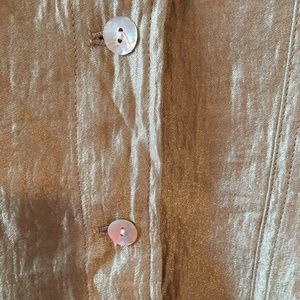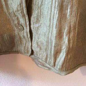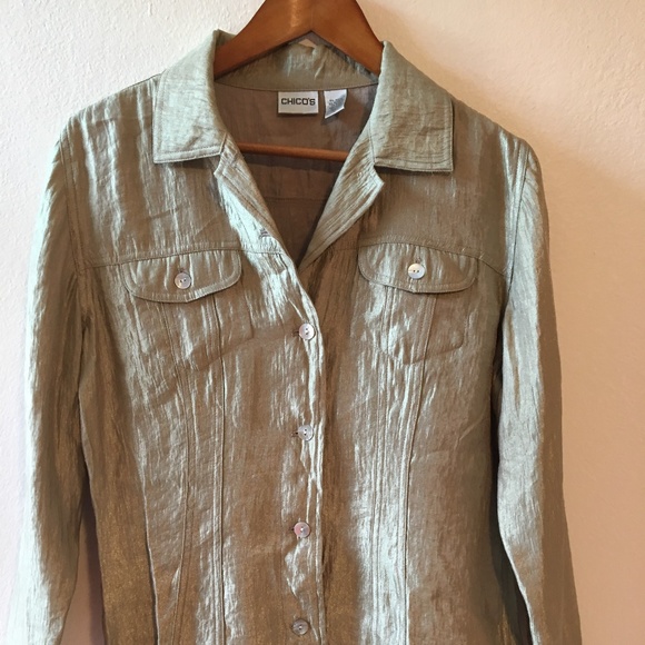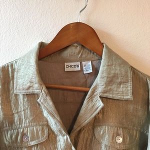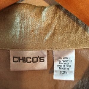 CHICOS button down shirt business like blouse. Beige / gold. No need to Iron. Chico’s Size 1 equivalent to standards USA Medium . Button down FITTED shirt. From a smoke free home.