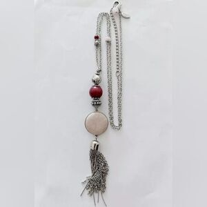 CHICO'S SILVER TONE BURGUNDY, PINK RESIN 32"-36" TASSELS (3") NECKLACE NWOT