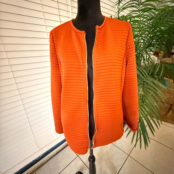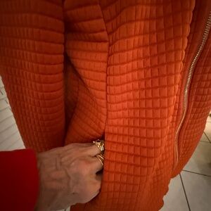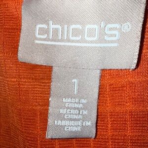 CHICO'S SIZE 1 RUST/BURNT ORANGE FULL ZIP 95% POLY, 5% ELASTANE, TEXTURED KNIT JACKET IN SEASON-CORRECT COLORS. THERE IS EVEN A MATCHING KNIT BURNT ORANGE CREAM-STRIPED TOP! CHECK OUT THE CLOSET. BUNDLE AND GET POSHY WITH IT AND SAVE SOME CASH, TOO.