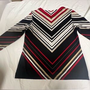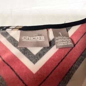 CHICO’S STRIPED BLACK, RED AND WHITE 3/4 SLEEVE SHIRTTAIL HEM SCOOP NECK SIZE 1