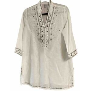 CHICO'S SZ 0 WHITE & Silver EMBELLISHED TUNIC TOP SEQUIN BEADED Linen Blend