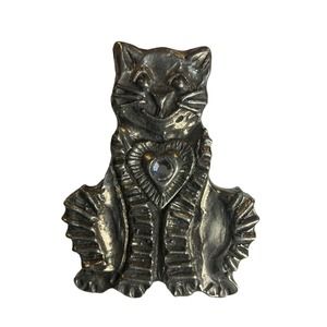 CHICOS Silver Tone Kitty Cat Pin Broach With Clear Round Rhinestone. Silver is not a shiny silver but more muted with a slight antiqued look.