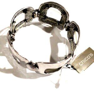 Elevate your style with this CHICO'S silver-tone stretch bracelet, featuring bold geometric shapes and a sleek, polished finish. Designed for comfort and effortless wear, this bracelet easily slips on and adds a touch of modern sophistication to any outfit. Perfect for stacking or making a statement on its own.