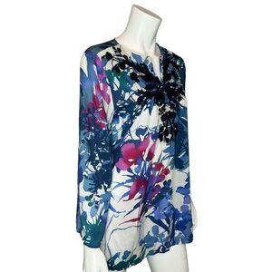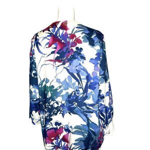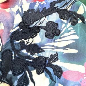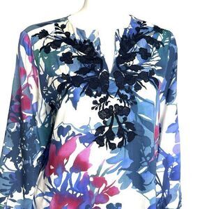 CHICO'S Size 1 US M Beautiful Watercolor Floral 100% Modal Top with Black Contrasting Crochet Floral Lace Trim and Cute Silver Tone Metal Charm with Chico’s Logo Under Collar on Back. 3/4 Length Flare Sleeves. Super Soft & Lightweight!