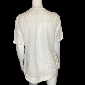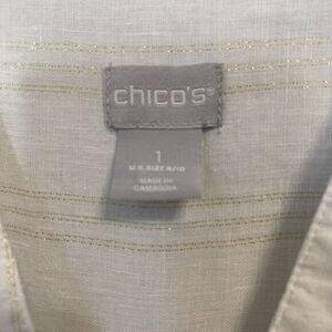Chico’s 100% Linen White Short Sleeve Button Up Blouse with Metallic Gold Vertical Stripes. Women’s Size M Chico’s 1