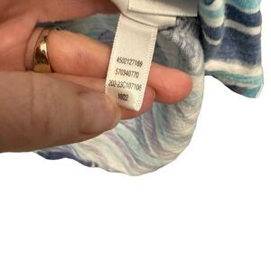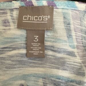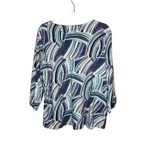 Chico’s Geometric Print Knit Top with 3/4 Length Roll Tab Sleeves. Aqua Blue, Purple, Blue & White. Women’s Size XL Chico’s 3