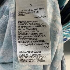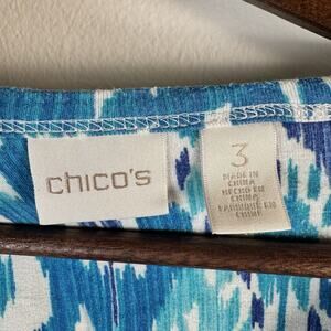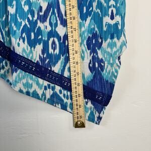 Beautiful Chico’s tunic top featuring a vibrant blue & teal ikat print. Made from a soft, stretchy rayon blend with a flattering flowy drape. Designed with an asymmetrical hem and navy lace trim detail for added style. Perfect for everyday wear, travel, or warm-weather outings.