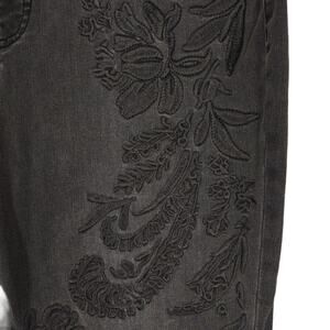 -Features: Front embroidered designs, flared leg, stretch denim in black, 5-pocket, zipper fly with top button, belt loops, mid-rise