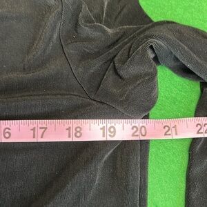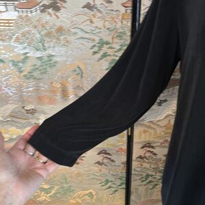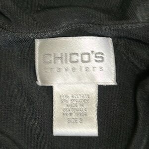 Chicos travelers, black double V-neck three-quarter sleeve, black slinky, material travel friendly wrinkle resistant naia sustainable fabric 96% Accutane and 4% elastin size 3 check up pics comment with any questions