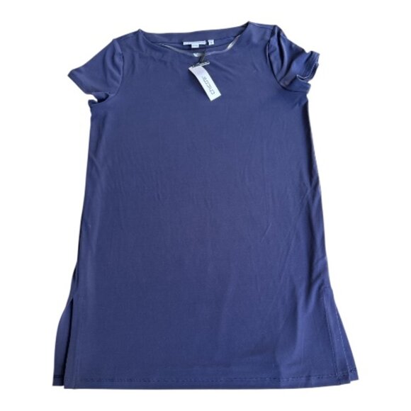 Packable navy blue tunic that will take you from day to evening. It has a great slinky feel and will come out of your suitcase without a wrinkle. It's a women's size medium but check the photos with measuring tape to see if it's right-size for you.