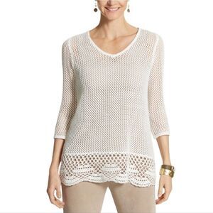 CHICO’S Travelers Collection Off-White 3/4 Sleeve Crochet Sweater Size 1 Small