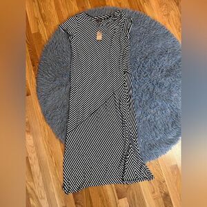 This short-sleeve dress is crossing all the right lines in a bold striped design that's spliced at opposing angles.
