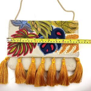 CHICO'S Tropical Embroidered Small Woven Purse Tassels Chain Strap Colorful