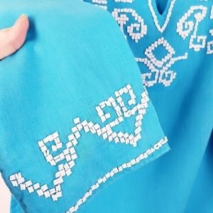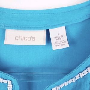 CHICO'S Turquoise Linen Cotton V-Neck White Beaded Tunic Top Size 1