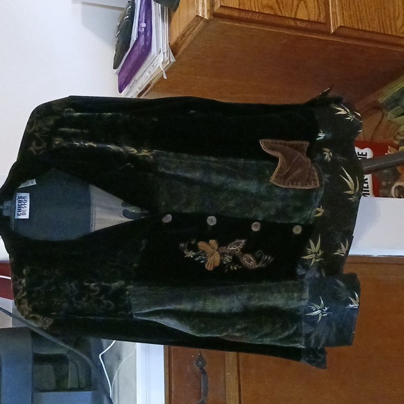 Velvet and silk jacket size 2 (12-14), button down with cuffed sleeves. Lightweight Velvet , with silk design. Could use for formal or casual jeans. In excellent condition.