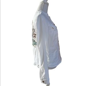 CHICO’S WOMENS WHITE JEAN JACKET SIZE 8-10 WITH PRETTY FLORAL ON BACK