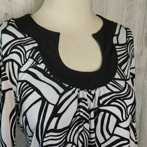 CHICO's career blouse with white background and black lined pattern and black trim. Unique rounded/notched neckline- similar to keyhole style. Bell sleeves. This would look great at the office or pair with some sparkles, jeans and black boots for a night on the town. 92% polyester, 8% spandex- lightweight and stretchy. Chico's size 1, but Chico's has unique sizing, so this is a medium or 8-10 per the size chart in the last photo. Excellent condition. Non-smoking, pet-free home.