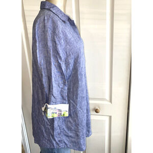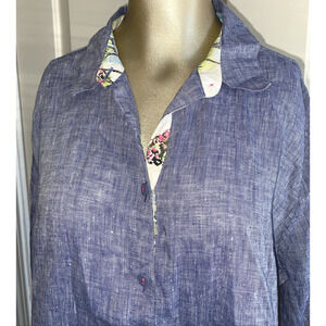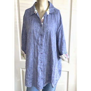 CHICOS Women 2 L Blue Linen Button Up Shirt No Iron Scenic Trim Cuff Neck