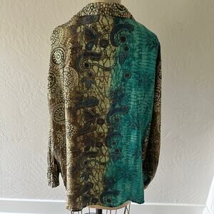 Colorful, mixed media look patterned button down long sleeve blouse from Chico's.
