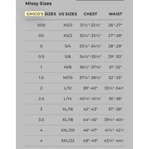 - See the 3rd Photo for the Chico’s Size Conversion Chart