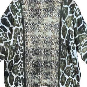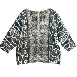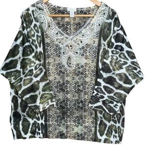 CHICOS Women’s Green Animal Print Beaded Boho Chic Relaxed Fit Blouse 3/XL