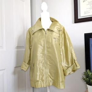Yellow/green nylon jacket from Chico's. Features roll tab, three quarter length sleeves, zipper pockets, and collar. Chico's size 2 which is equivalent to a Large (12).