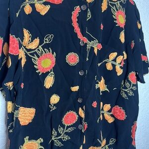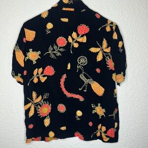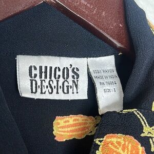CHICO’S artsy novelty print rayon top size medium floral turtle black colorful