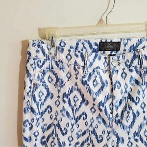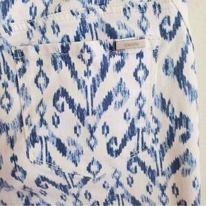 Super cute ikat patterned pants by Chico’s in their “So Slimming” cut. Chico’s size 1 which corresponds to a size 8. Waist measures 16.5” across and the inseam length is 29”. Excellent preowned condition.