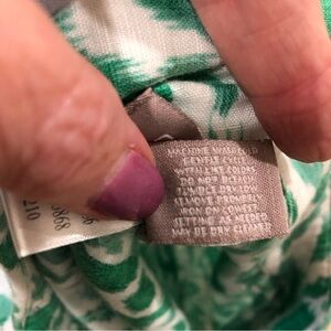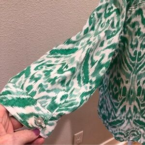 Chicos linen blend button up blouse with 3/4 sleeves. Button closure on cuffs. Watercolor pattern in shades of green on white background. Pre-owned with minimal signs of normal wear and maintenance. Size 3 Chico’s which is equivalent to size XL.