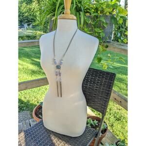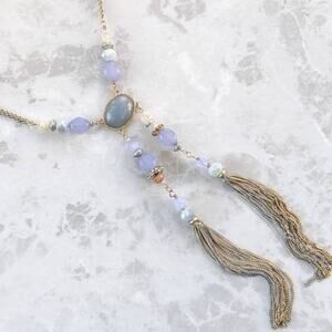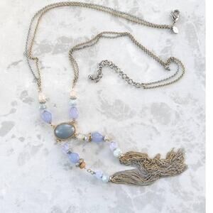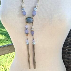 CHICO'S silver and gold tone tassel statement necklace, lavender purple accent