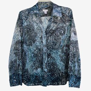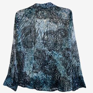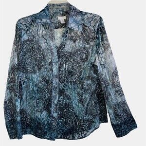 CHICO'S Blue paisley multi-print Burnt-Out Velvet Button-down-the-Front Blouse with Button Cuff Long Sleeves; Collared Neckline; Soft In very good condition and is Fresh & Clean and Ready-to-Wear - Has been laundered in Ecos non-scented soap and hung dry just prior to listing. Chico's Size 1 = USA Size M - Bust-41/ Waist-40/ Length-25"