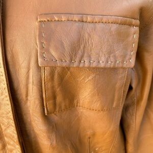 No tag to indicate the size but I would say it’s a medium/large. Measurements include pit to pit 23 inches sleeve from neck to wrist 23 inches length 24 inches. Last photo taken is off another reseller site shows that it’s a leather jacket.