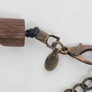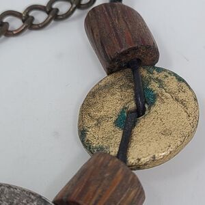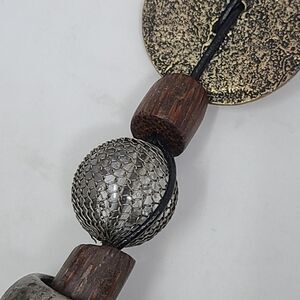 Chunky metallic disk and wooden beaded necklace. It has silver, copper and gold tones. The necklace measures at approximately 25" with a 3.5" extender and is finished off with a lobster clasp closure. There is some wear on some of the beads, please see all photos. Thank you so much for looking. I am always open to reasonable offers. Have a fantastic day.