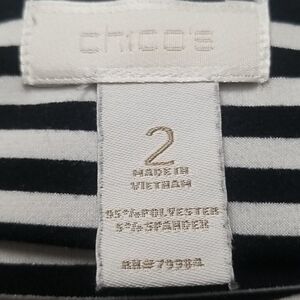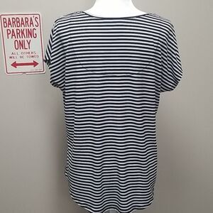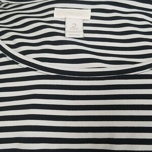 Nice comfortable top. Black and white stripes. High - low hemline. Hemline is approximately 2" longer in the back. SZ 12-14. 95% Polyester 5% Spandex. Length in the front 25".