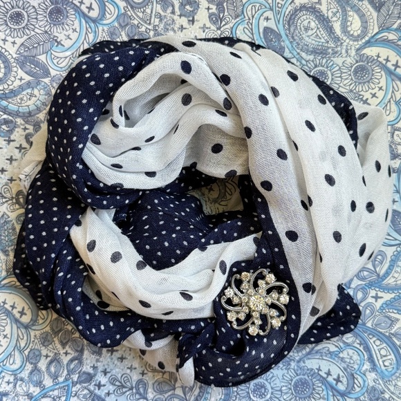 scarf, oblong, polka dots, lightweight, rayon, navy, white, pattern