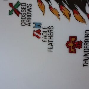 pre-owned with wear. gold trim. some faded lettering and scratch on front on his face.