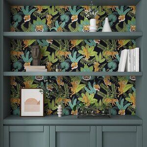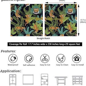Vibrant jungle print wallpaper roll featuring lush green leaves and striking orange tiger design. Perfect for adding a bold touch to any room. CHIHUT 17.7”x236” Woodland Tiger Peel Stick Wallpaper Jungle Leaf Removeable New in package! Smoke free/pet free