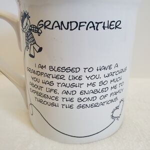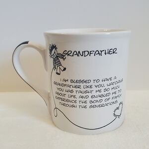Children Of The Inner Light Grandfather White Black Coffee Cup Mug. Marci by Art Impressions by Papel Giftware. Large 16 oz, high-quality stoneware, microwave & dishwasher safe, plaid designed handle. Inspirational message on back, "I am blessed to have a Grandfather like you. Watching you has taught me so much about life, and enabled me to experience the bond of family through the generations." Inner brim reads,"The bonds we have are everlasting." Embossed artwork of Grandpa with glasses & hearts. No chips, cracks, or stains. Like new condition!