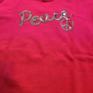 Like new in excellent condition. Blend of Pink on top and orange/coral color mid to bottom. Peace logo and sign in sequins. Goes great with leggings!! 100% cotton. Girls size 7/8.