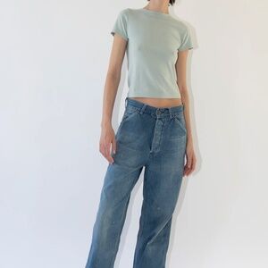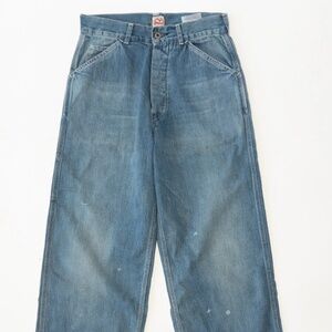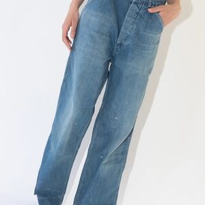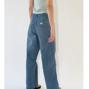Denim Painter Pant in Light Distress from Chimala. These high waisted jeans have a a wide, straight leg. Features a button fly, 5-pocket style and an additional workwear pocket on the leg.