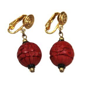 Chinese Export carved cinnabar dangle clip earrings. Excellent condition. See the penny for size.