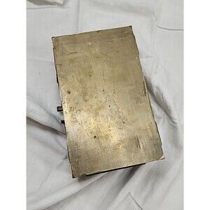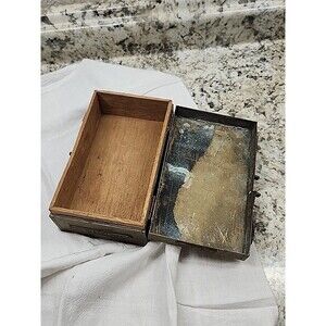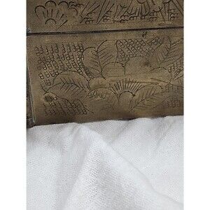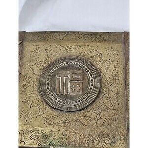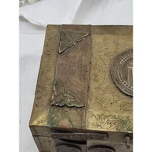 Vintage Chinese trinket or jewelry box with detailed etched brass medallions and wood insert Measures approximately 7 x 4 x 2.5 inches. A stunning piece for collectors or as a functional and decorative storage chest for keepsakes. missing front latch, but can still be locked
