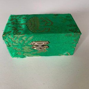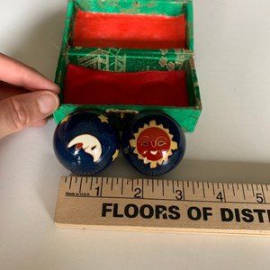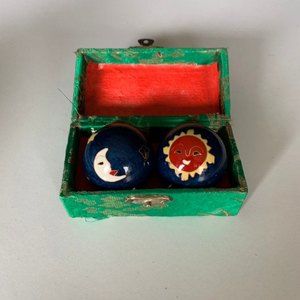 Dark blue enameled relaxation balls. They chime when moved. Sun and Moon with stars design. Come in green fabric box.