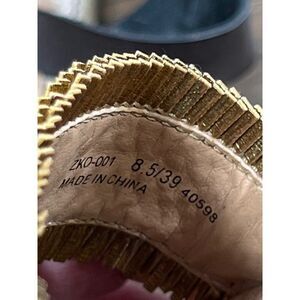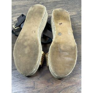 The Ziba wedges are constructed with a tall braided jute sole and feature braided frayed detailing along its vamp. You’ll especially love the leather adjustable buckle ankle straps for a finishing touch. Fringed toe strap in bronze; rich, deep chocolate straps with gold tone hardware. Approx 2” platform; 4 position buckle closure. In excellent condition!