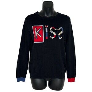 Black mid-weight sweater detailed with Kiss slogan in primary hues and finished with cuffs in contrasting colors.