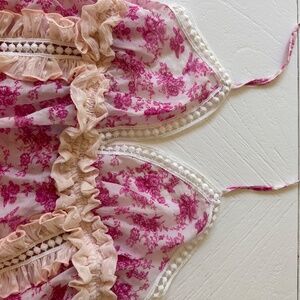 CHIO Floral Frill S hort Dress in Pink - Size Medium, Semi-sheer fabric with ruffle trim, unlined pull on styling Halterneck tie closure MADE IN ITALY NWOT Never worn
