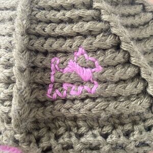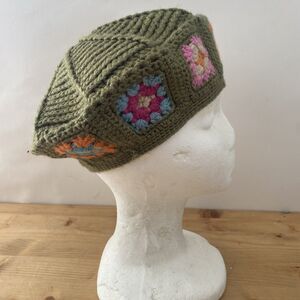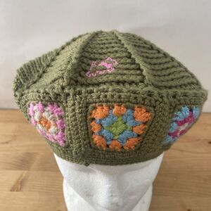 It doesn't get any cuter than this hand-made crocheted beret. This is olive green with 10 panels on the top, and nine colorful granny squares framing the face. The yarn is a wool and acrylic blend, and the Chipie label has a small Scottie dog on it, with a matching hand-embroidered dog on the side of the cap. It's in excellent condition with minimal use.