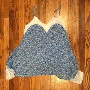 NEW Chlah Sleeveless Flowy Tank Top. Blue with lace detailing and floral design. Side panels flow outward for extra boho feel.
