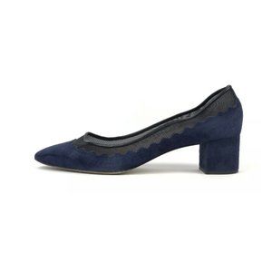DETAILS AND INSIGHTScallop Navy Suede Pump From Chloe1.75" Chunky HeelClosed Toe With Navy Suede Scallop And Black Mesh DetailNarrow In Toe And Loose Fit In HeelSuede And Mesh Upper With Leather Sole, Insole, And LiningMade In ItalyAvailable In NavyStyle CH23041NWOBSize 36.5