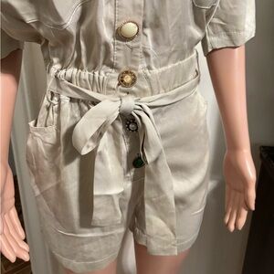 Chic khaki romper with button-up front and tie waist. Features green and white with gold button accents.